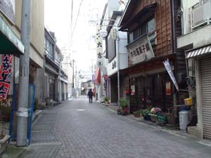 駅から50m程の交差点。歩き始める。レンガ敷き舗装された商店街、松の内で時間が早いため、まだほとんどの店が閉まっている。寒ーい!