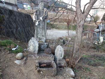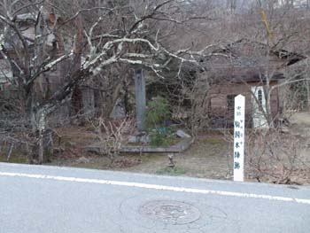 ようやく人里に下りてきた。この付近で初めて人と出会う。直ぐ下を流れる沢の水は凍りついている。