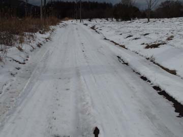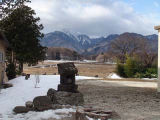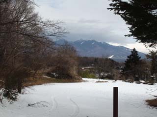 前方の山は入笠山。スキー場が見える。大勢の人が滑っている。旧甲州街道は雪で覆われている。 |