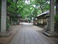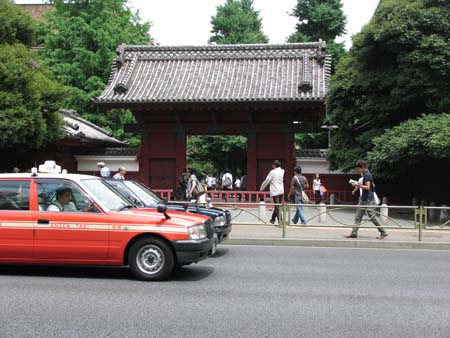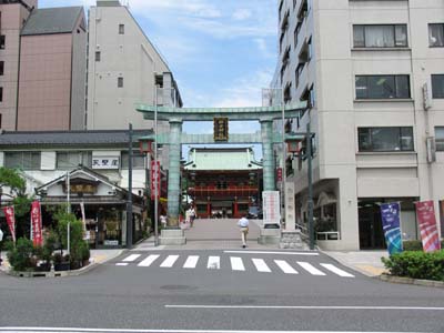これが有名な江戸を代表する神社の一つ。両側のビルが迫っている