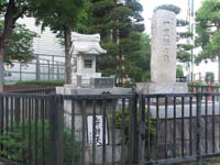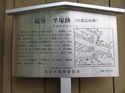 ここは、日光御成道(旧岩槻街道)との分かれ道で、中山道の最初の一里塚があった。18世紀中頃まで、榎が植えられていた。度々の災害と道路の拡張によって、昔の面影をとどめるものはない。分かれ道にあるので、追分一里塚とも呼ばれてきた。