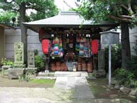 「八百屋お七」に因む地蔵尊。天和2年(1682)におきた天和の大火の後、恋仲になった寺小姓恋しさに放火の大罪を犯し、火あぶりの刑を受けた「お七」を供養するために建立されたお地蔵様である。