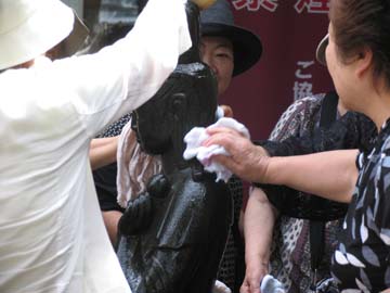 今日もお年寄りでにぎわっている。例によって石のお地蔵を大勢の人がゴシゴシと磨いている。肩や首が磨り減っている。