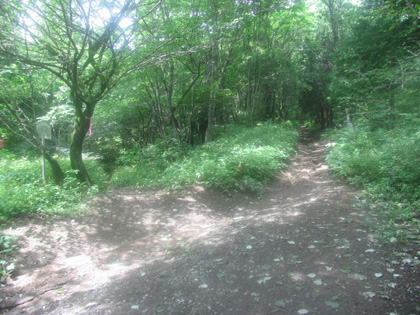 ここで道はY字に分かれる。左が旧中山道、右は御巡幸道、左の道にはヒルが出現するという。当然、左の旧中山道を進む。 |