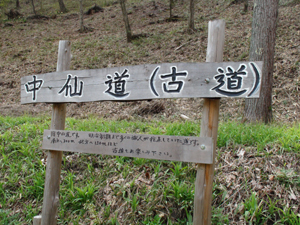 江戸時代には、本町(枡形の町並み)の角を曲がり、中町に入ったところの左右に2基の一里塚がありました。(碑より30メートル下方)。一里塚は土を丸く山に盛って造られているので、南に向って右側を下の山と呼び、左側を上の山と呼んでいました。この一里塚の位置は