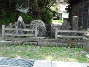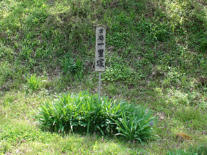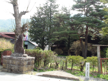 水田の一角に文化年間(1804〜1817)建立の「朝日将軍苗*(=漢字不明)木曾弾正小弼伊予守義元公墓」と刻んだ石碑が建っている。