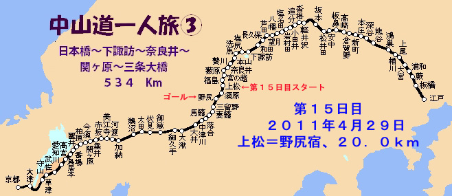 甲州街道から岡谷、塩尻経由前回の最終到着地点「上松宿」へ向かう。 |