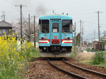 2両編成。乗客は全部で6人。次の駅では7-8人が乗り込んだ。 |