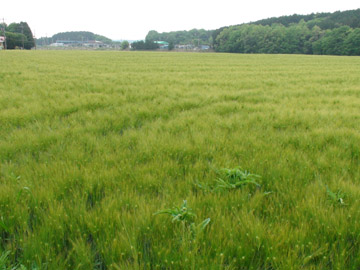 遠くに低い丘を連ねる田園風景。水稲が10〜15cmに伸びている。
