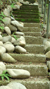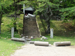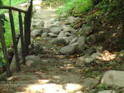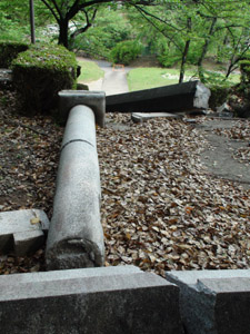3・11の大震災の影響で石造りの階段がいたるところで崩落している