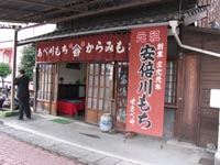 | 橋の近くに「安倍川餅」を売る店が数軒連なっている。 柔らかい餅にきな粉と小豆あんをまぶした安倍川餅を2個を買う。200円。安倍川橋を渡りながら食う。つきたての柔らかい餅が実に美味い。 |