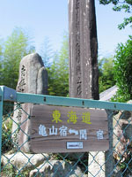 ここ東の追分は伊勢別街道の分岐点で、鳥居は伊勢神宮の式年遷宮の際、古い鳥居を移築するのがならわしになっている。江戸方への次の宿は、亀山宿である。道標には外宮(伊勢神宮)まで15里(60キロメートル)と刻まれている。 |
