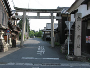 | <水口「あめや旅館」(=左)と北町の鳥居(=右)> |